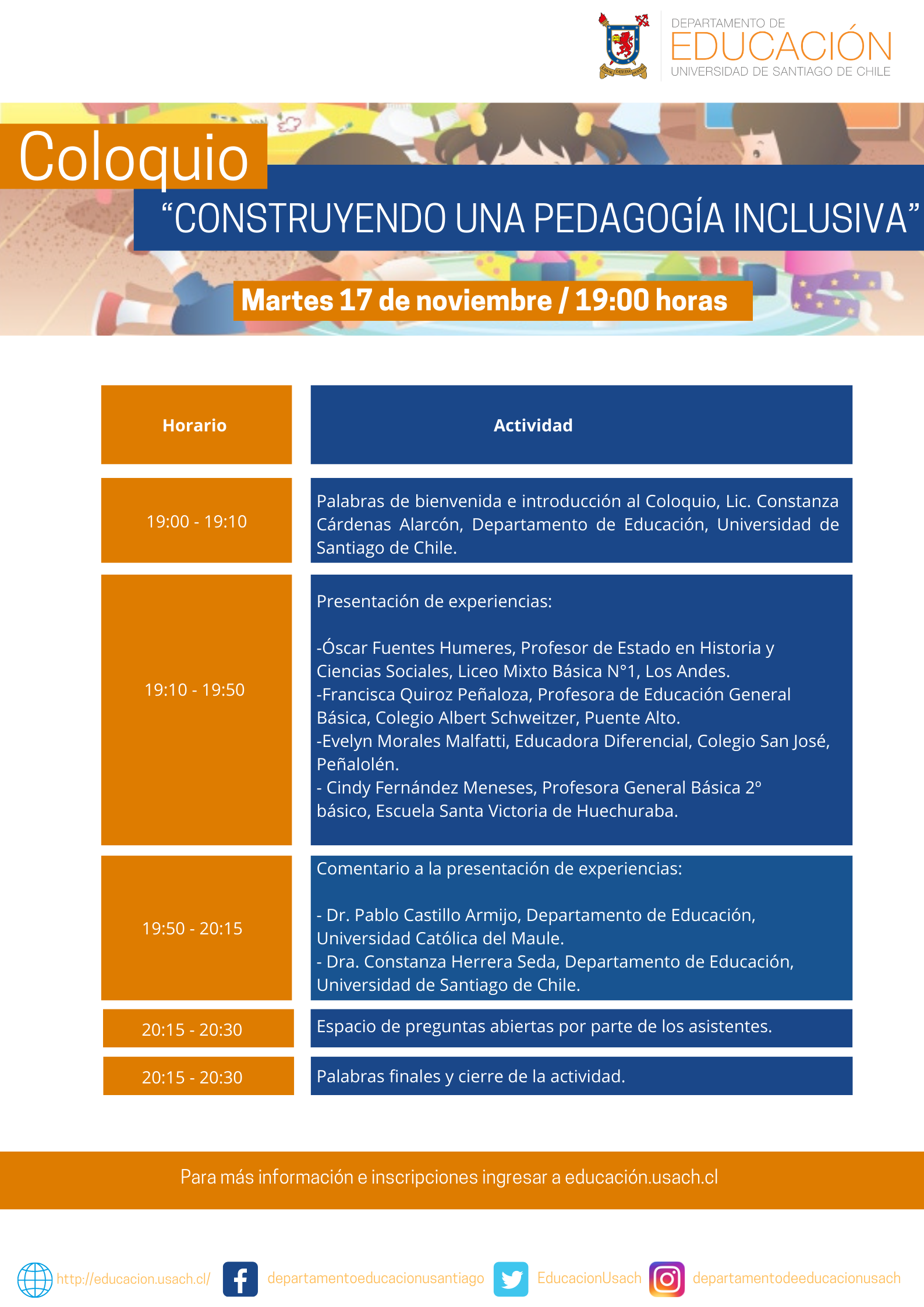 “Construyendo una pedagogía inclusiva”, es el nombre del Coloquio que organiza nuestra Unidad, en el marco de las asignaturas "Taller de Necesidades Educativas Especiales" de Pedagogía en Educación General Básica y "Taller de inclusión escolar" de Pedagogía en Filosofía.