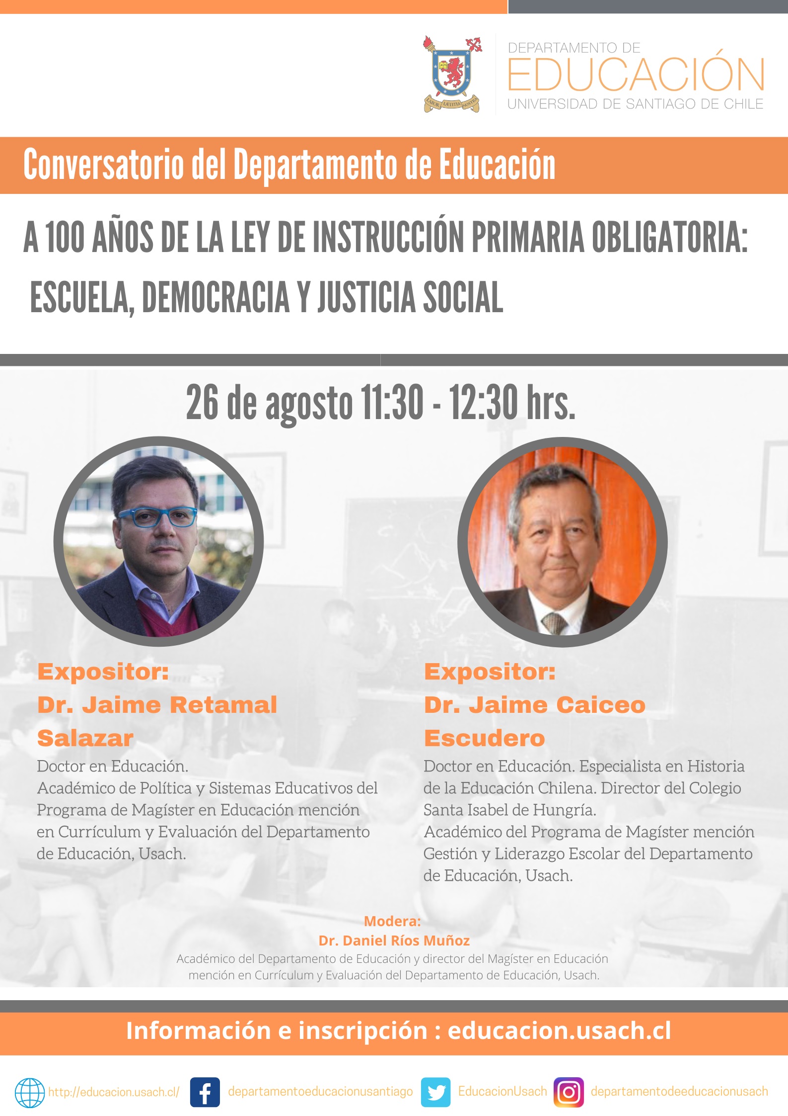 Los expositores para esta ocasión serán el académico y experto en Políticas y Sistemas Educativos y académico del Programa de Magíster en Educación mención Currículum y Evaluación del Departamento de Educación, Dr. Jaime Retamal Salazar y Dr. Jaime Caiceo Escudero, especialista en Historia de la Educación Chilena. Además, Director del Colegio Santa Isabel de Hungría y Académico del Programa de Magíster mención Gestión y Liderazgo Escolar. La actividad será moderada por el Director del Magíster en Educación, mención Currículum y Evaluación, Dr. Daniel Ríos.
